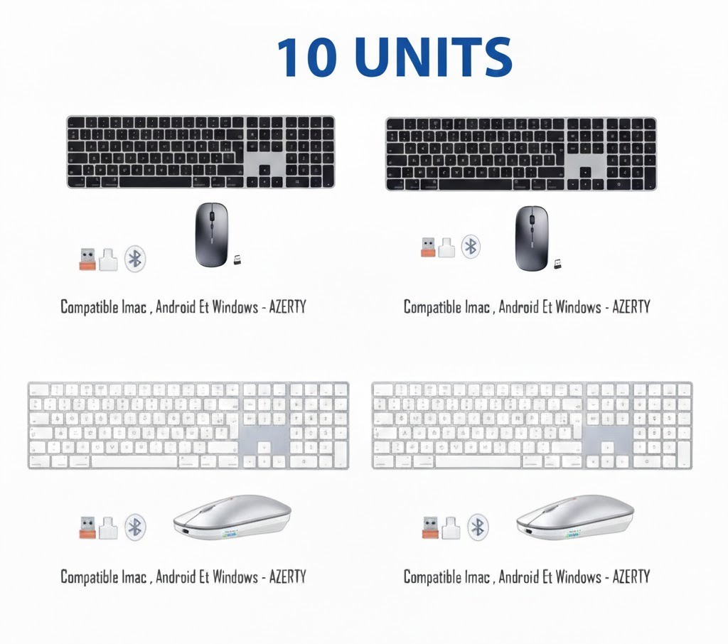 Lot de 10 Ensembles Clavier + Souris Sans Fil Bluetooth AZERTY – 5 Noirs & 5 Blancs – Compatible iMac, Android et Windows
